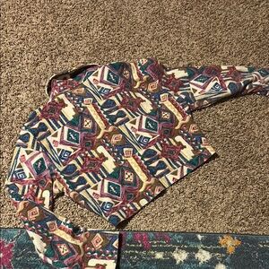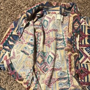 Cropped jacket with a geometric pattern. Features a mix of colors for a bold look.