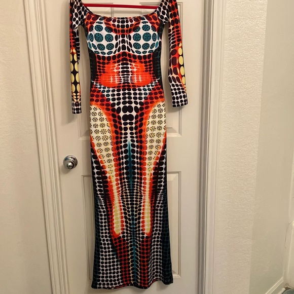 Stand out in this vibrant maxi dress featuring a bold geometric pattern. Perfect for any occasion, this dress combines style and comfort effortlessly. Off the shoulder maxi size medium