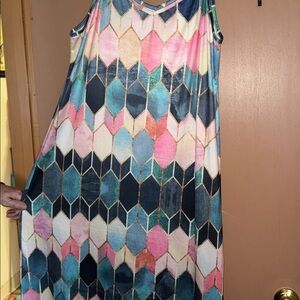 Vibrant tank top with a geometric pattern. Features shades of pink, blue, and gold accents.