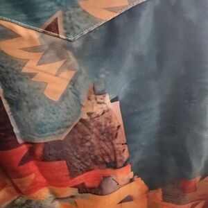 Vibrant pants with a geometric pattern in teal, red, and yellow. Perfect for a bold look. new never worn. 32" inseam. fits size 24W