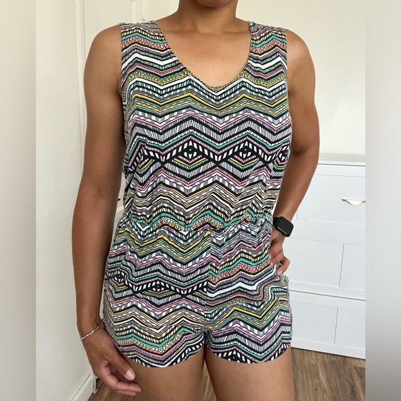 Vibrant romper with a geometric pattern. Features a mix of black, white, pink, yellow, and green colors. Perfect for casual outings.