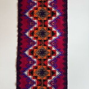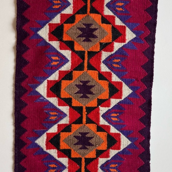 Wool woven fiber art in vibrant colors. Great to become a pillow or on a table.