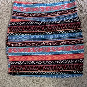 Charlotte Russe Vibrant stretchy skirt with geometric patterns. Features red, blue, orange and black