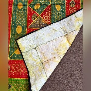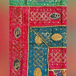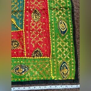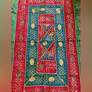 Vibrant tapestry with geometric patterns in red, green, and yellow. Perfect for adding a splash of color to any room. So beautiful! 😍 Bright and colorful gold sequined authentic Indian tapestry. Such bold, vibrant colors & eye catching sparkle with the sequins. Excellent condition. Would make any room stand out!