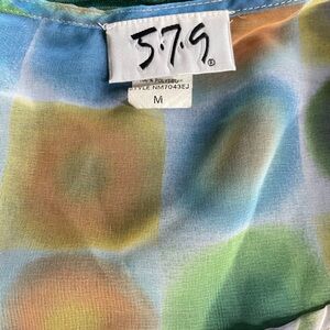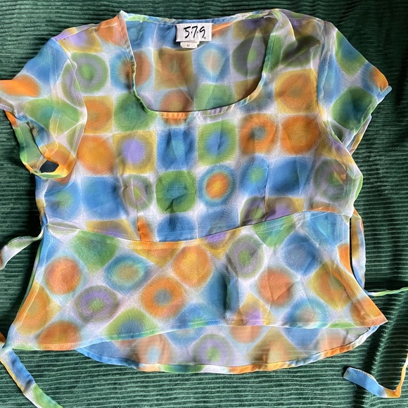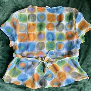 Chic top with abstract design. Features blue, orange, and green hues. Ideal for a standout style.