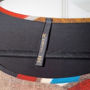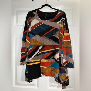 Vibrant top with geometric patterns in blue, red, and yellow colors. Have a little pocket purse on bottom left corner of top. So convenient for carrying small things you!