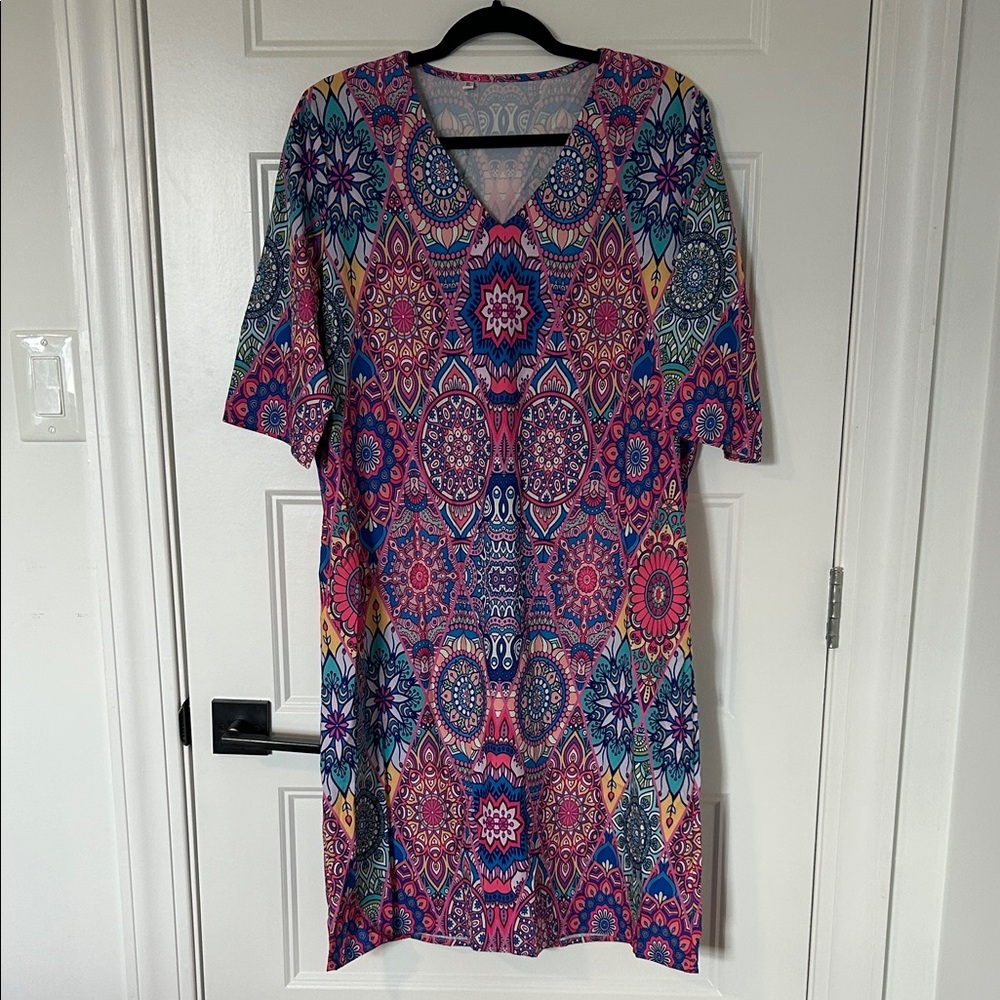 Bright and bold top with geometric patterns. Features a mix of pink, blue, and cream colors.