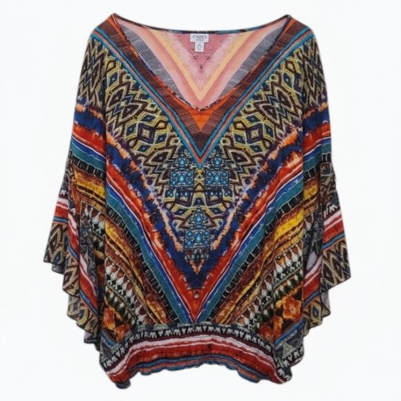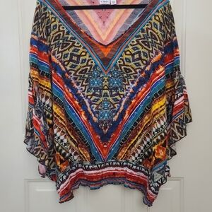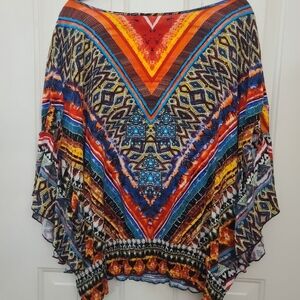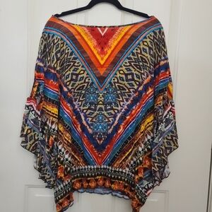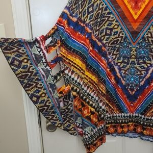 Vibrant top with geometric patterns. Features a mix of blue, orange, and red colors.