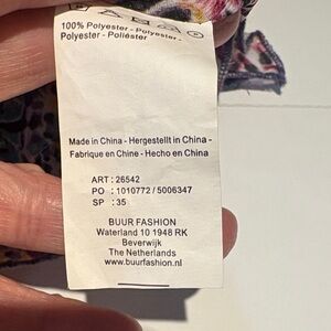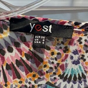 Vibrant top with a geometric pattern. Features pink, blue, and orange hues.