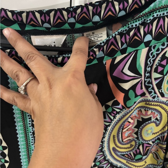 Vibrant top with geometric patterns in purple, green, and black. Eye-catching design for any occasion.