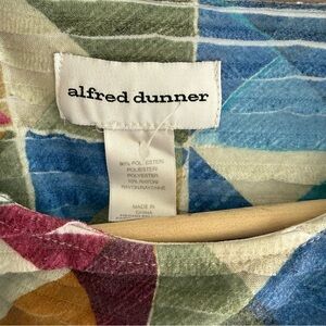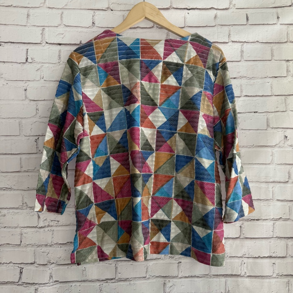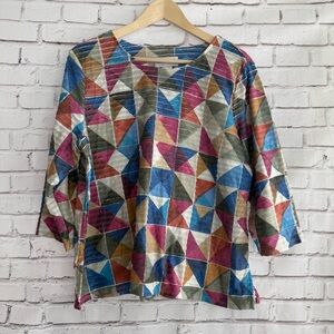 Stylish top with geometric design. Features blue, pink, green, and cream tones. Ideal for a bold look. 3/4 sleeve.