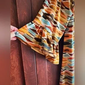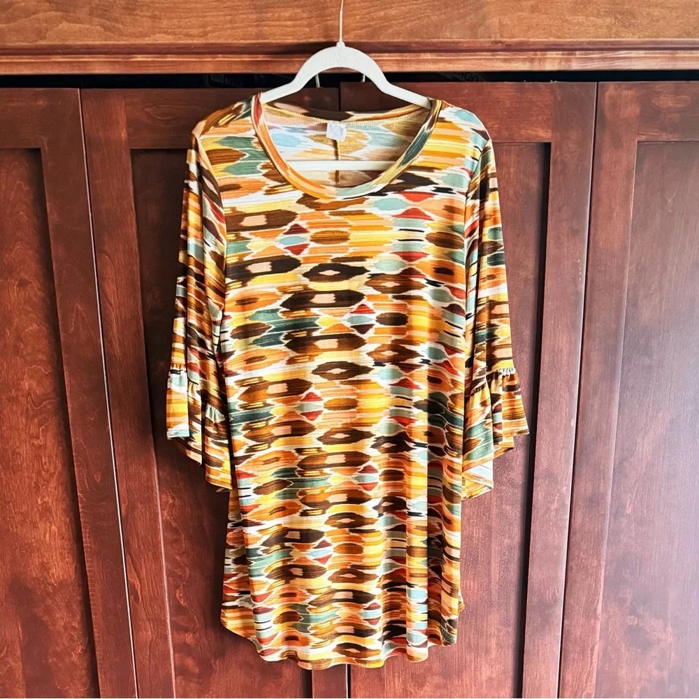 Vibrant top with a geometric pattern. Features shades of orange, yellow, and brown. Length from shoulder to bottom - 32”