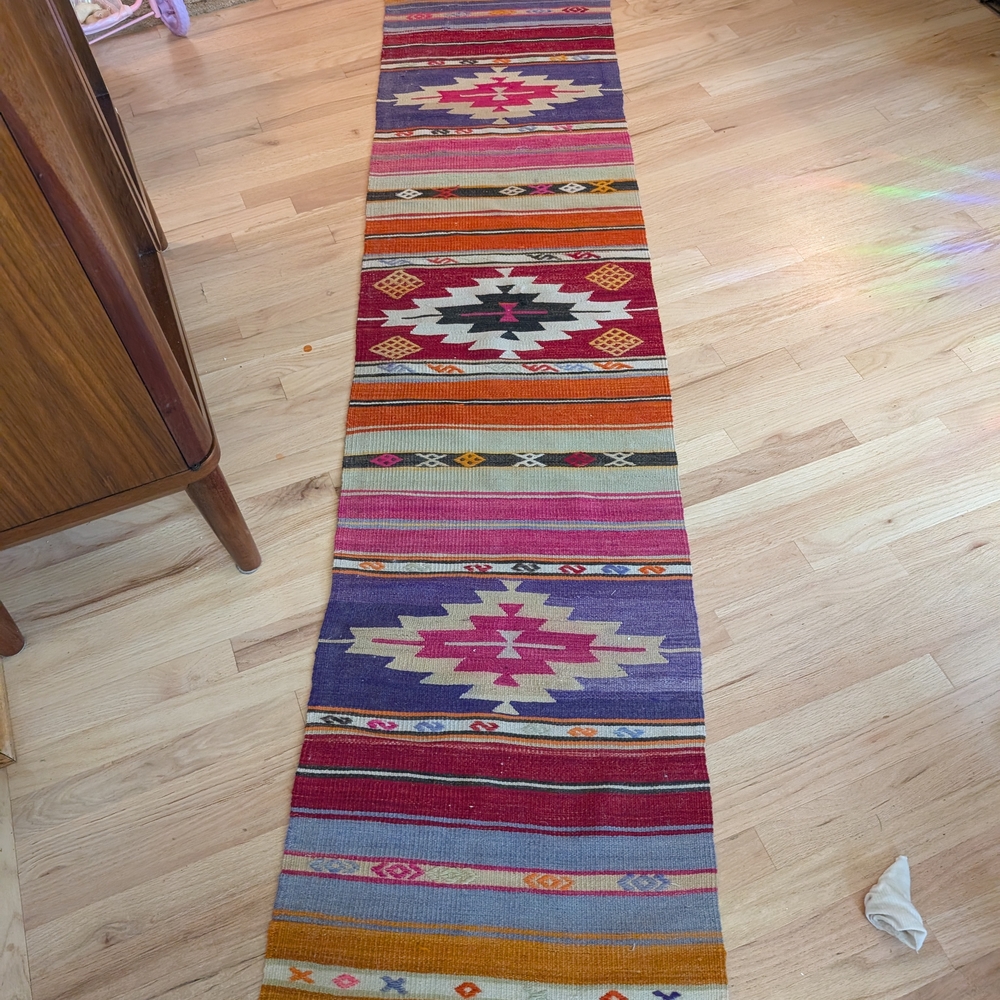 Vibrant runner rug with geometric patterns. Features shades of red, pink, orange, and blue. 94" long. 21" wide. vintage wool rug