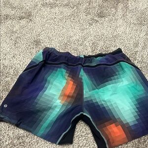 Vibrant shorts with a geometric pattern. Features shades of blue, teal, and orange. Stylish and comfortable for casual wear.