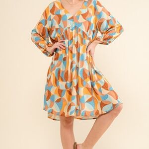 Embrace vibrant style with this colorful geometric print dress. This printed open back puff sleeve dress is a trendy and playful option for a fun and stylish look. Perfect for any occasion. Stand out with its unique design and comfortable fit.
