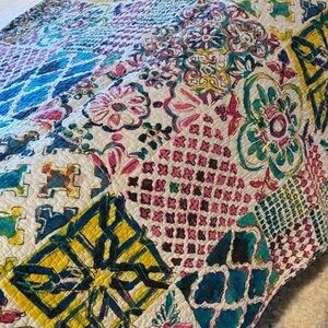 Brighten your bedroom with this colorful geometric quilt. Its vibrant design brings a lively touch to your decor.