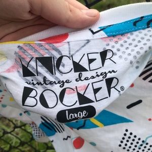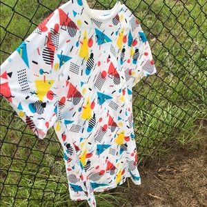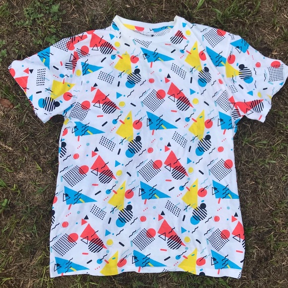 White vintage-style t-shirt from Target, featuring a colorful geometric pattern🍉🍒🍓Labeled a men’s L, but def fits more like M. Would be so cute under some overalls 4 the ultimate 90s fit😚✌️💕