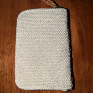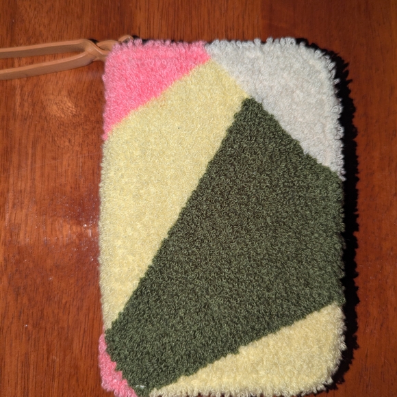 A stylish pouch with a geometric design. Features pink, yellow, green, and cream colors. Perfect for carrying essentials.