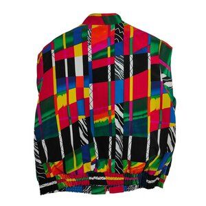 Vibrant women's jacket featuring a bold geometric pattern. Perfect for adding a pop of color to any outfit.