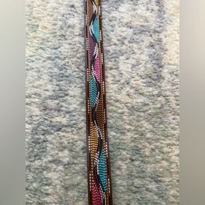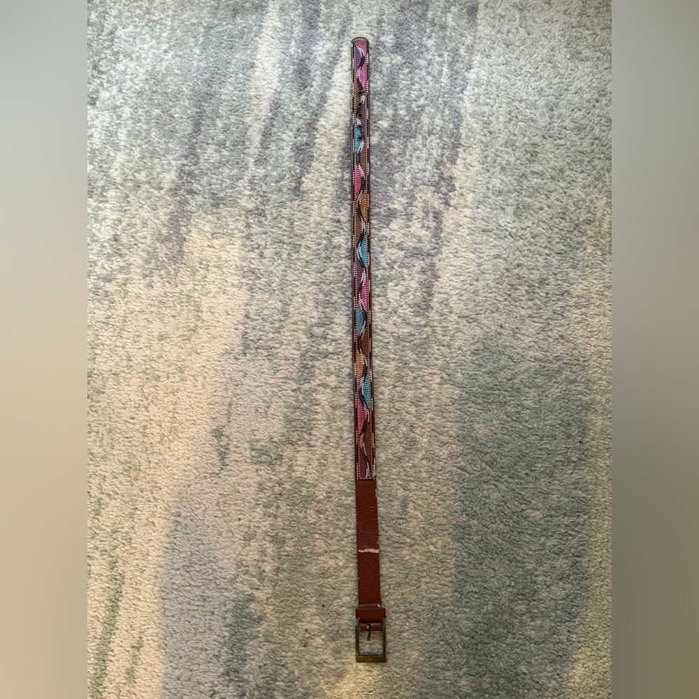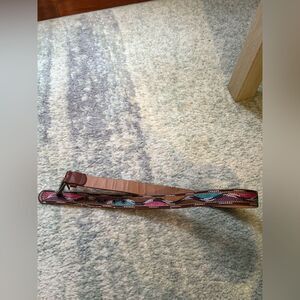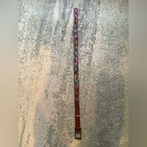 Stylish belt with a colorful geometric pattern. Features a mix of vibrant colors. Sizing is a small/medium. It has a lot of evidence of wear and tear but it’s still cute on.