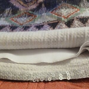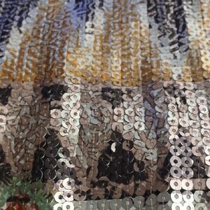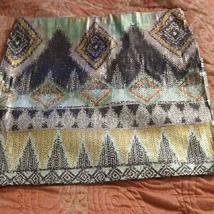 Vibrant sequin skirt with geometric patterns. Features shades of green, blue, and yellow.C-5