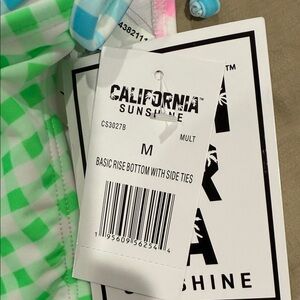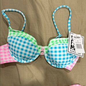Vibrant gingham bikini set featuring blue, green, and pink colors. Perfect for a stylish beach day.
