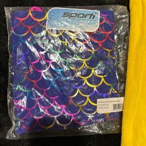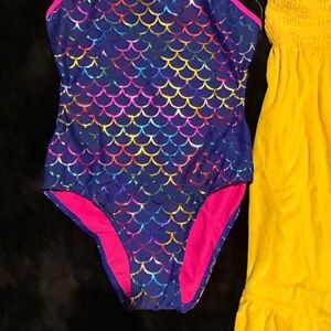 Vibrant kid swimsuit with mermaid scale pattern. Features a mix of colors including blue, pink, and yellow. Sporti brand new swimsuit with tags. Size 34. Yellow cover up is used, not new. Super cute together.