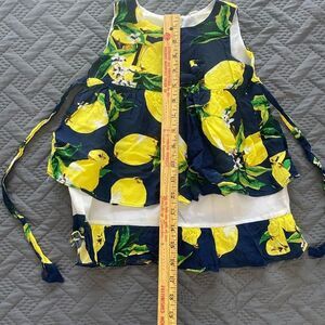 Set of three girls' dresses. Includes a pastel striped dress, a navy dress with cherry print, and a navy dress with lemon print.