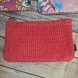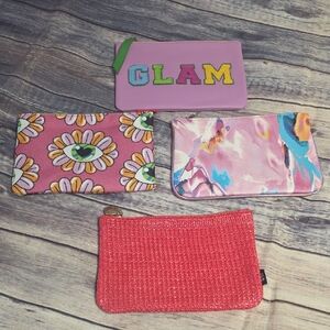 Set of four vibrant pouches. Includes pink, multicolor, and red designs. Perfect for adding style to any look. Set of 4 cosmetic bags.