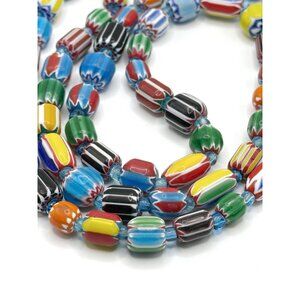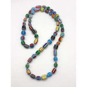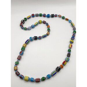 The Colorful Glass Chevron Beaded Necklace features a vibrant and eye-catching design, with the main stones being colorful glass beads arranged in a chevron pattern. This 28-inch necklace is a statement piece that adds a pop of color and personality to any outfit. Made from glass, this necklace is durable and perfect for everyday wear, making it a versatile and stylish accessory for any jewelry collection. In excellent condition.