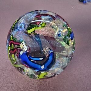 Vibrant glass paperweight with swirling colors. Features red, green, blue, and gold accents. 3 inchs in diam. adds, sophistication to any desk or table setting