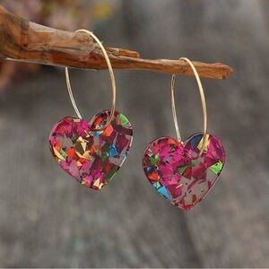 Vibrant multicolor heart-shaped drop earrings. Clear plastic with bright glitter, and gold metal hoops.