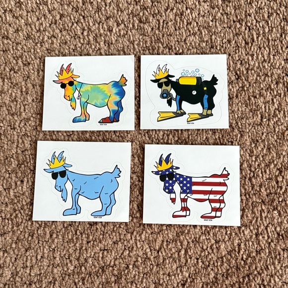 Set of 4 goat USA stickers. Add a splash of fun to your belongings with this colorful goat sticker set. Featuring vibrant designs in blue, black, and multicolor, these stickers are perfect for personalizing your space.