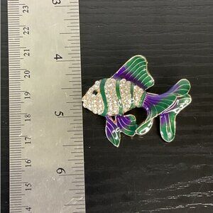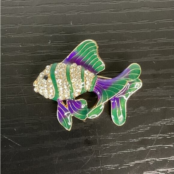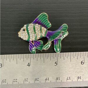 This artisanal fish-shaped brooch features a vibrant combination of purple and green enamel with shimmering rhinestone accents. Its gold-tone backing adds an elegant, luminous touch to the intricate design. A whimsical yet sophisticated accessory, it can adorn clothing, scarves, or bags, providing a unique statement piece for artistic and nature-inspired fashion lovers.