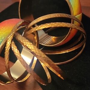 Add a pop of color to your outfit with this vibrant bangle set. Featuring a stunning gradient of blue, pink, and gold, these bracelets are perfect for any occasion. The gold accents add a touch of elegance.