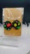 Round earrings with vibrant trippy graphic designs. Features red, yellow, and green accents on a black background.