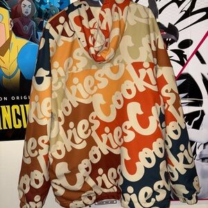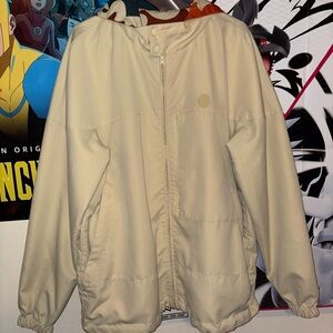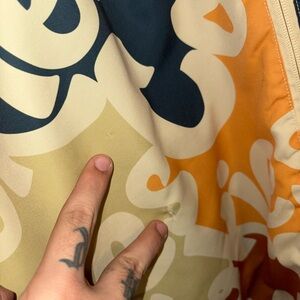 Vibrant jacket with bold graphic design. Features shades of cream, brown, and blue.