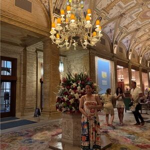 Vibrant maxi dress with playful graphics. I wore this for my honeymoon and was so comfy and pretty! It was also good that the strap was adjustable so that I didn’t need to concern about my bust size. Features a mix of colors including blue, green, and orange.