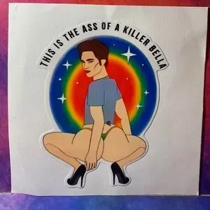 Vibrant sticker with a bold graphic design. Features a rainbow background and a striking figure.