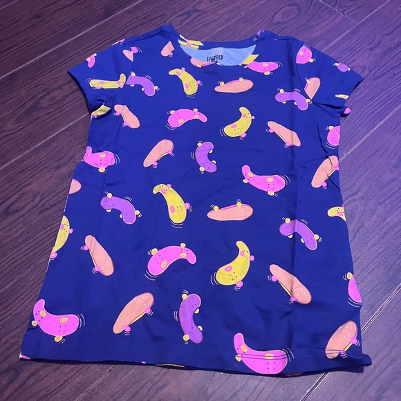 Vibrant t-shirt with playful graphics. Features pink, yellow, and purple designs on a blue background.