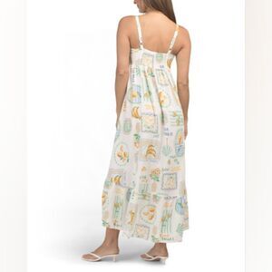 Vibrant maxi dress with playful graphics. Features a mix of orange, blue, and green designs on a white base. Perfect for a casual day out.