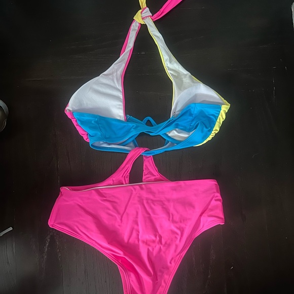 Vibrant bikini set with halter top. Features pink, blue, yellow, and white colors. Perfect for a beach day.