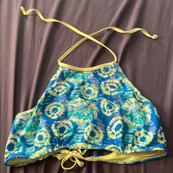 Vibrant halter top with a tie-dye pattern. Features a mix of blue, yellow, and green colors. Perfect for a casual day out. Fun in the sun has never looked so good.