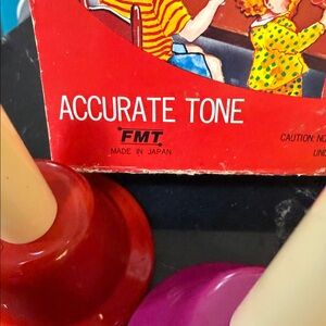 Vibrant hand bell set with multiple colors. Perfect for music enthusiasts. 8piece hand bell very vintage mint condition. Still in box. perfect condition. Very rare find Accurate ton FMT made i japan