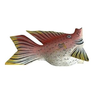 Charming hand-carved and hand-painted wooden fish figurine featuring vibrant colors and artisan detail. Measuring approximately 6.5” x 2” x 3.5”, this nautical-inspired piece makes a unique home décor accent or amulet. In good, not perfect artisan condition, adding character and authenticity to its handmade design.