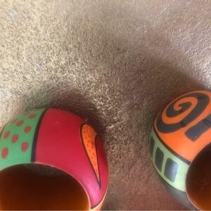 Brighten up your dining table with this set of colorful hand-painted napkin rings. Featuring vibrant hues of orange, red, and green, these rings add a playful touch to any meal.