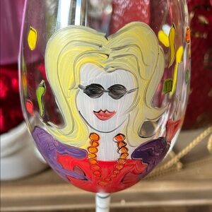 Vibrant wine glass with a hand-painted design. Features a stylish woman in red and purple. Perfect for adding flair to your drinkware collection.