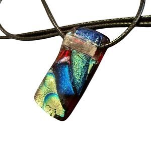 This is a gorgeous piece of handcrafted fused glass pendant with bold colors of blue, green, gold and red. It's rectangular in shape and measures 1.25" x .5". It's in excellent, like new condition with a black cord (16"-20")