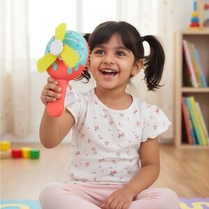 Brighten up playtime with this vibrant handheld fan toy. Featuring a fun yellow and red design, it's perfect for kids who love colorful toys.