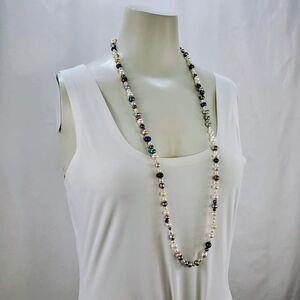 - long necklace of shiny white & multicolored freshwater pearls with no clasp or closure. Wear it long or double up & secure with a ribbon or pin.